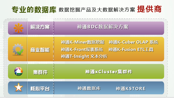 神舟通用公司主營業(yè)務(wù)主要包括神通關(guān)系型通用數(shù)據(jù)庫、神通KStore海量數(shù)據(jù)管理系統(tǒng)、神通xCluster集群件、神通商業(yè)智能套件等系列產(chǎn)品研發(fā)和市場銷售;诋a(chǎn)品組合,可形成支持交易處理、MPP數(shù)據(jù)庫集群、數(shù)據(jù)分析與處理等解決方案。公司擁有40余名實戰(zhàn)經(jīng)驗豐富的中高級數(shù)據(jù)庫技術(shù)服務(wù)人員,可提供數(shù)據(jù)庫系統(tǒng)調(diào)優(yōu)和運維服務(wù)。公司客戶主要覆蓋政府、電信、能源、交通、網(wǎng)安、國防和軍工等領(lǐng)域,率先實現(xiàn)國產(chǎn)數(shù)據(jù)庫在電信行業(yè)的大規(guī)模商用。